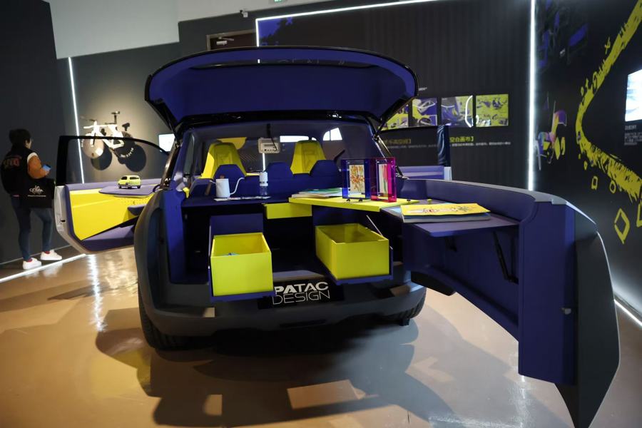 “流光驰心(行)”板块聚焦于水陆空的个人出行设计。展品涵盖多种形态,从经典摩托、量产车型到概念载具、代步机器人,再到水上交通工具等。这一板块中,《GEN-Z探索概念车》将汽车改装成“街头店铺”。主创之一陈先生介绍,灵感源于“地摊经济”,“后备箱可以拉开,成为一个C型的空间,就像摆摊一样。”后座车窗,则被改造成“潮玩收纳箱”。车内安装投影仪,宛如移动的私家影院。“这款概念车的目标人群是不想被定义、且有多元需求的年轻人。”