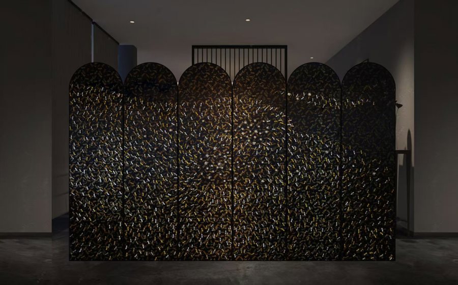 设计篇中,“栖光筑影(住)”板块试图呈现居住空间从功能场域向情感与智慧载体的蜕变。上海大学上海美术学院设计系副教授初旖的作品《吉祥中国 蜓花系列——感应互动开花动态屏风壁画-3》,采用云锦缎面、色织锦缎等中国传统非遗丝织工艺面料,结合金属蜻蜓、镍钛记忆金属花朵构成六条屏形制。特别的是,当人走近屏风,其上的金属花朵便会慢慢绽放,当人远去,花朵又会逐渐合上。这是因为作品内置了纳米制热芯片,并设置人体感应装置,打造出“人来花开,人走花合”的效果。